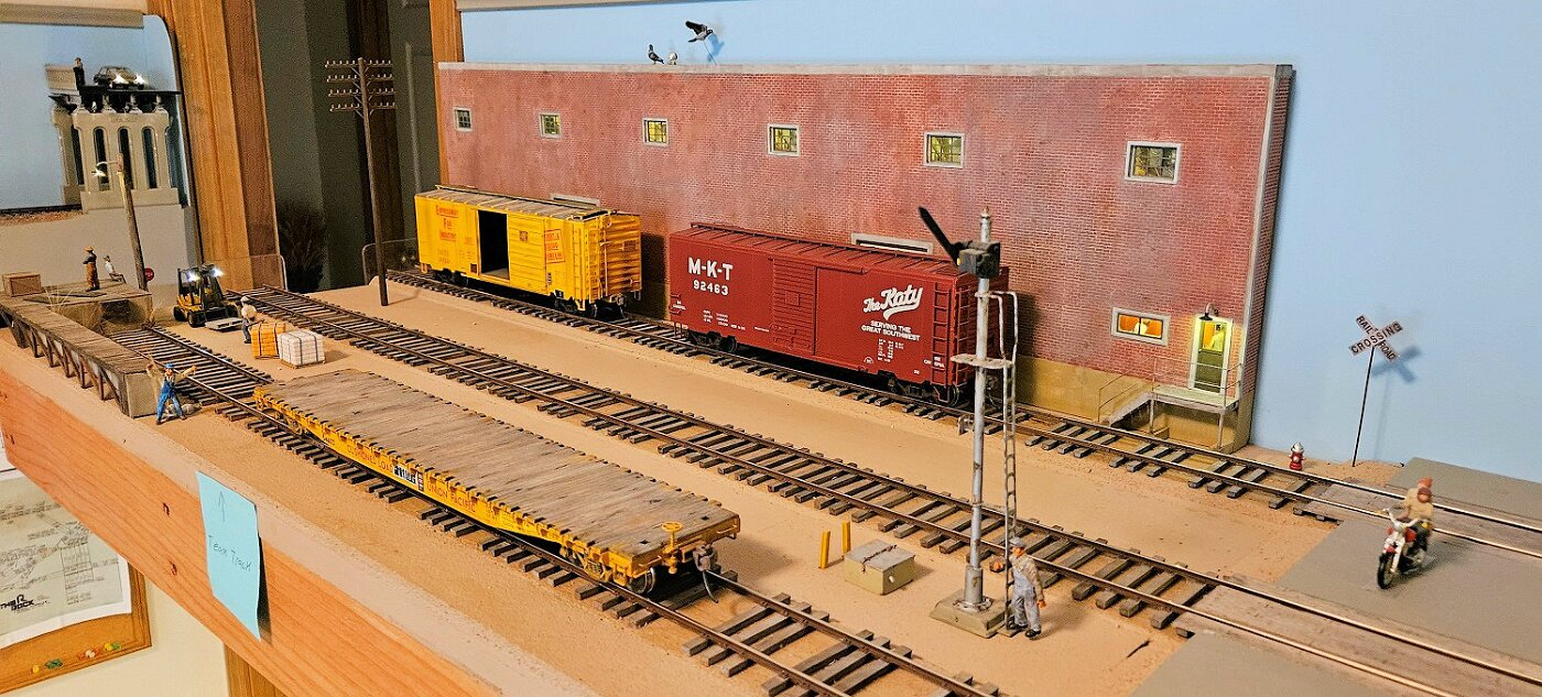 A quick look at his O scale layout in a 10x10ft room, over the desk and work area. This trial in O, built in 2013-2014, eventually lead Kevin to convert his large HO layout in the basement to O. See that layout in other album.