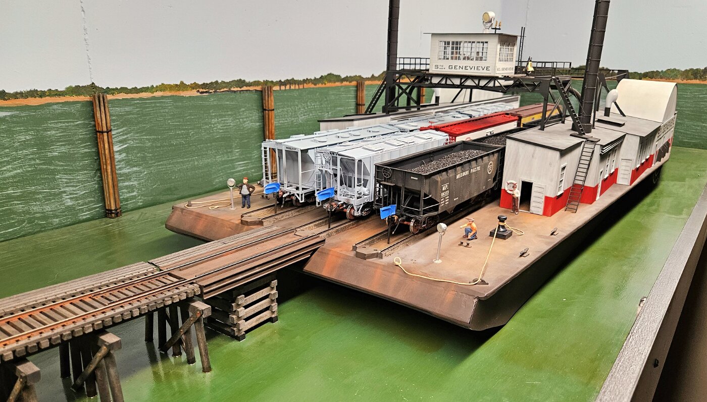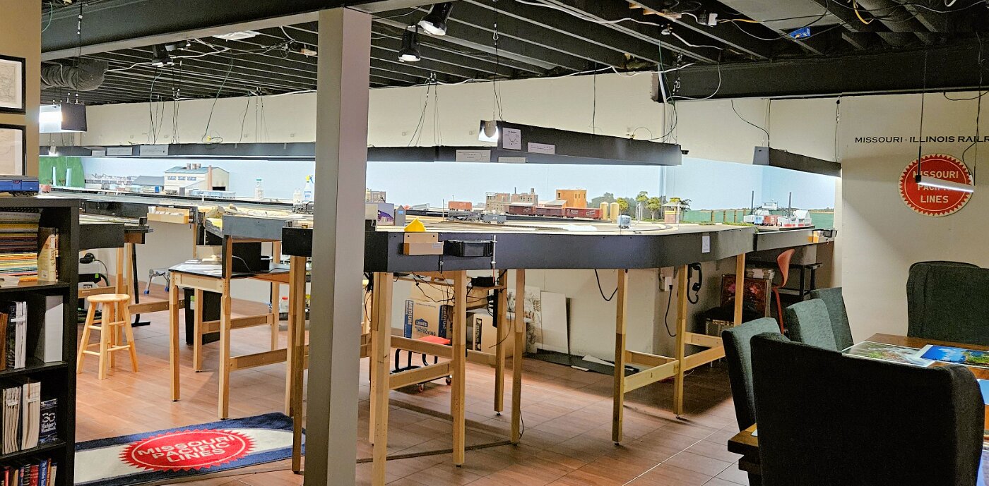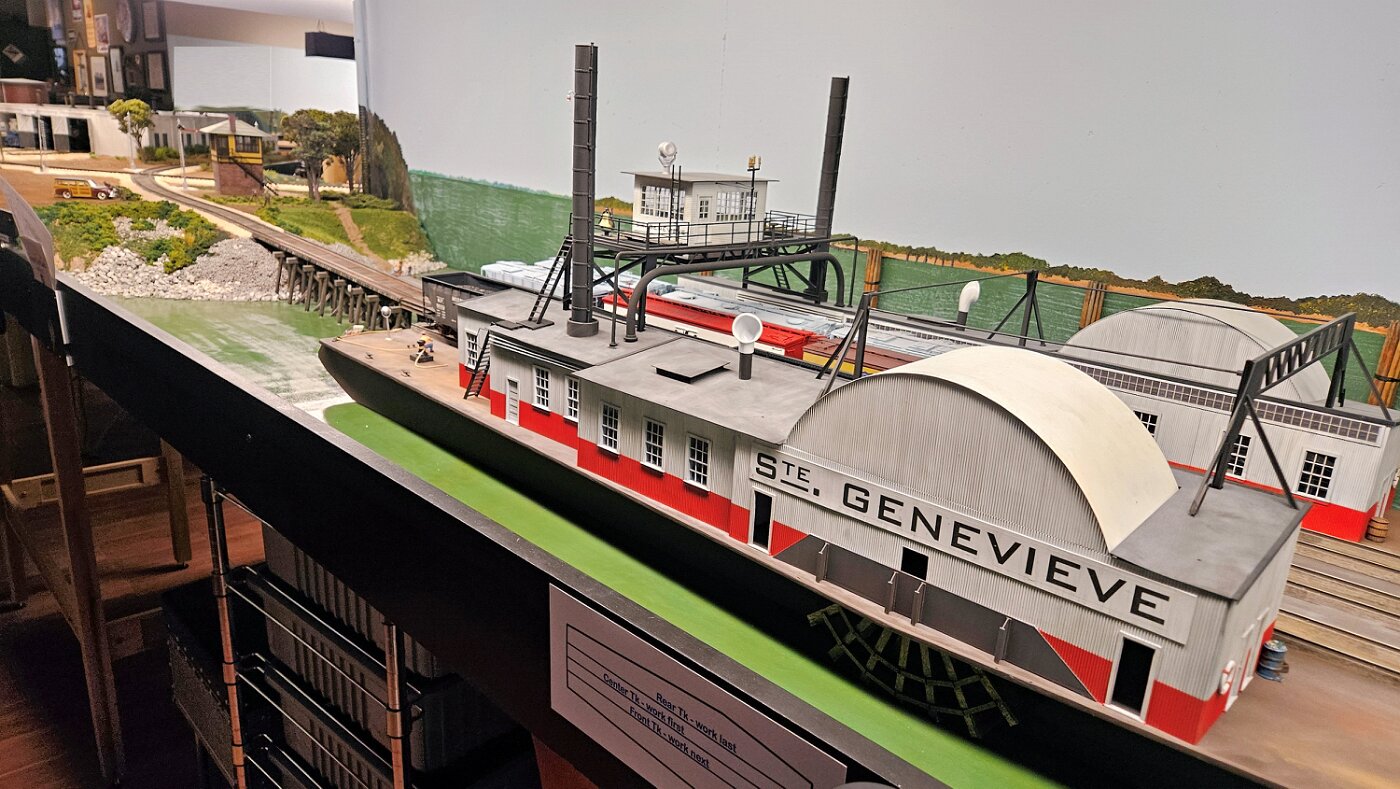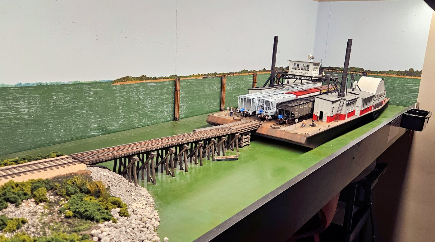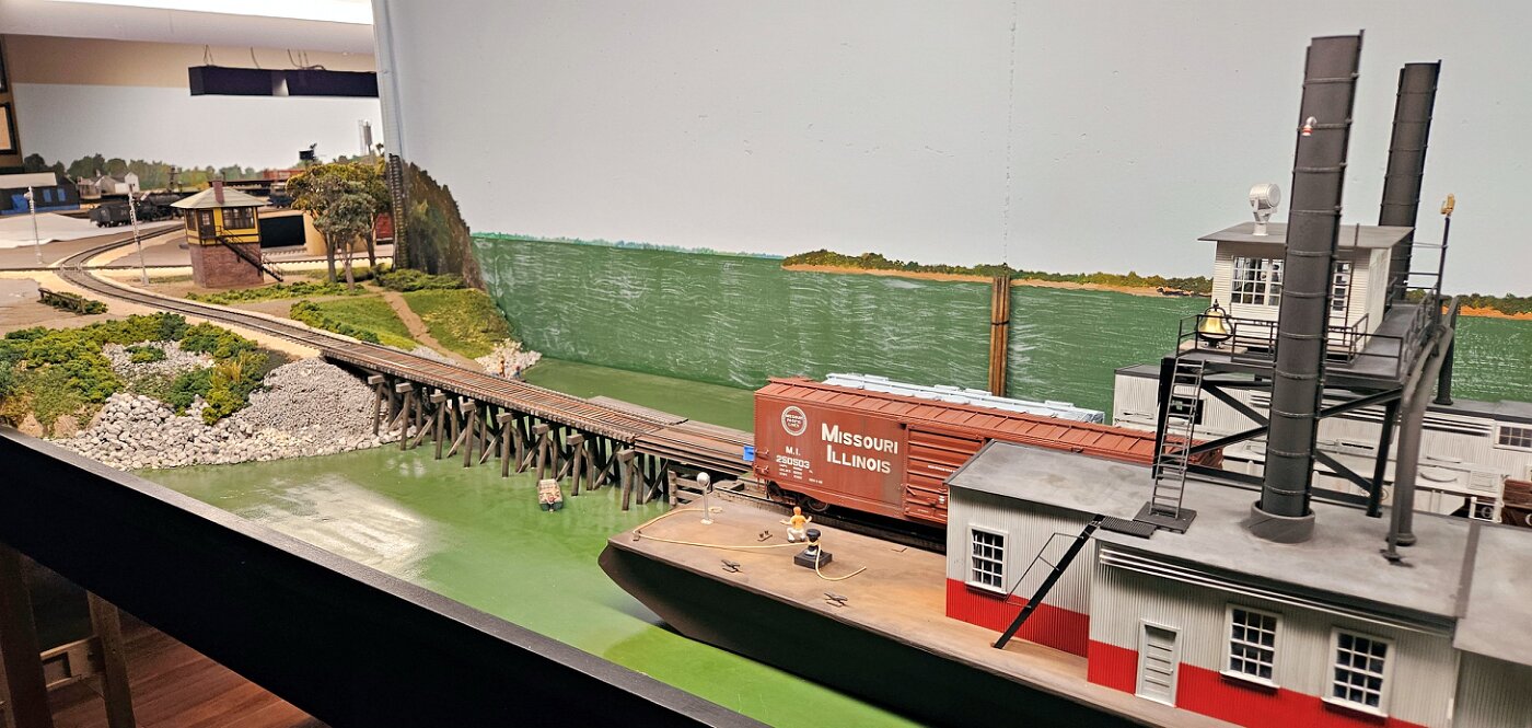 Gregg Laiben's railroad is a Proto48 layout (O scale, exact scale trackage), is set around a 35 mile subdivision of the M-I. It features a River Ferry operation and service yard, with a local run and large quarry operation. Lots of details.